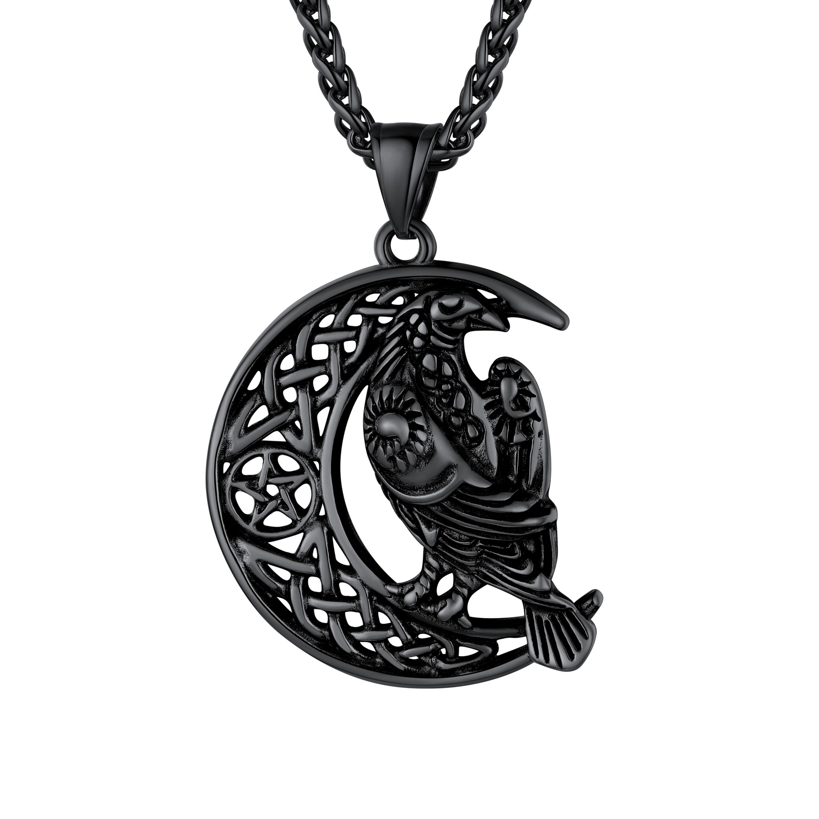 U7 Viking Talisman Necklace Plating Stainless Steel Crescent Moon Pendant Norse Viking Raven Necklaces for Men