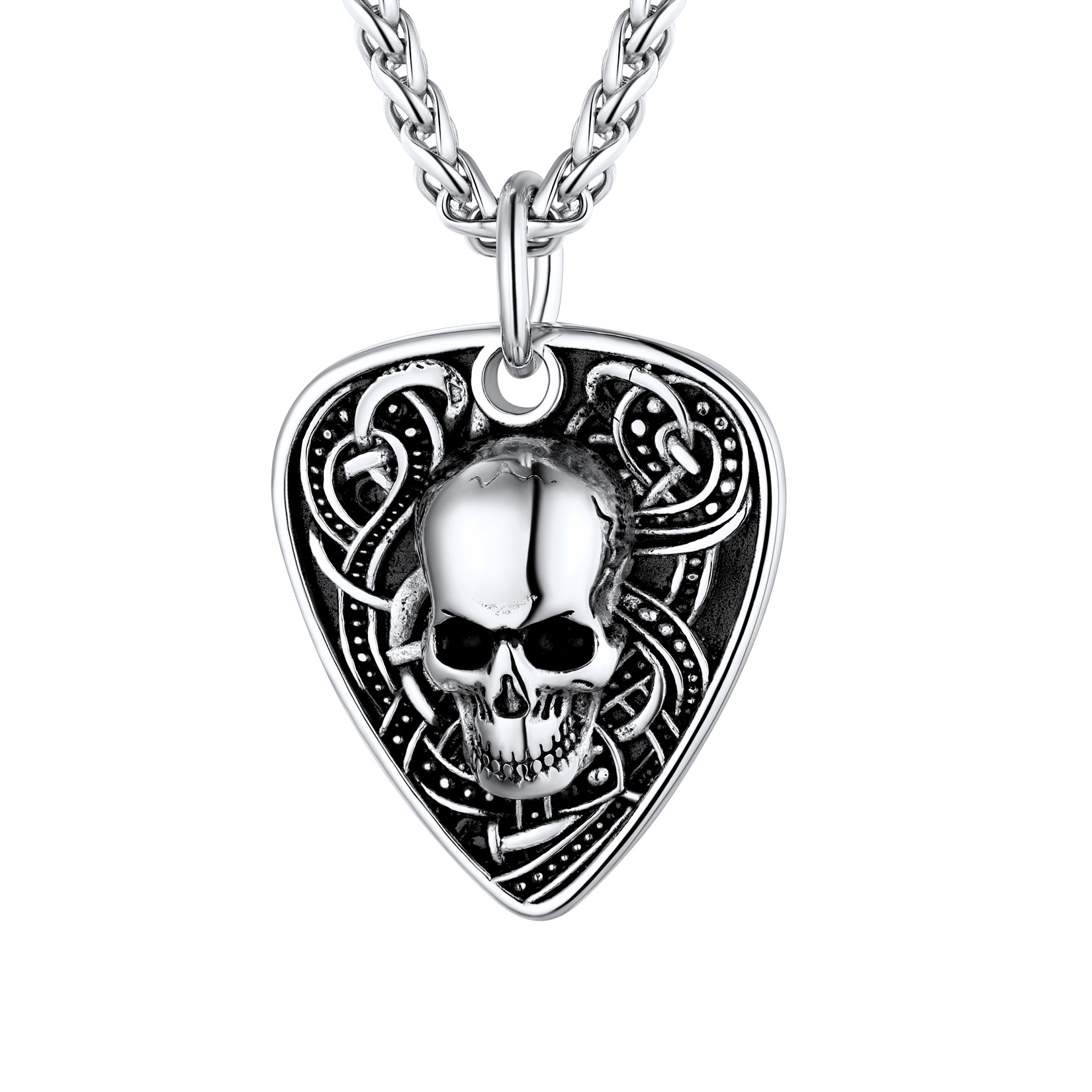 U7 Skull Guitar Pick Men Stainless Steel Hip Hop Punk Silver/Black Pendant Gothic Necklaces