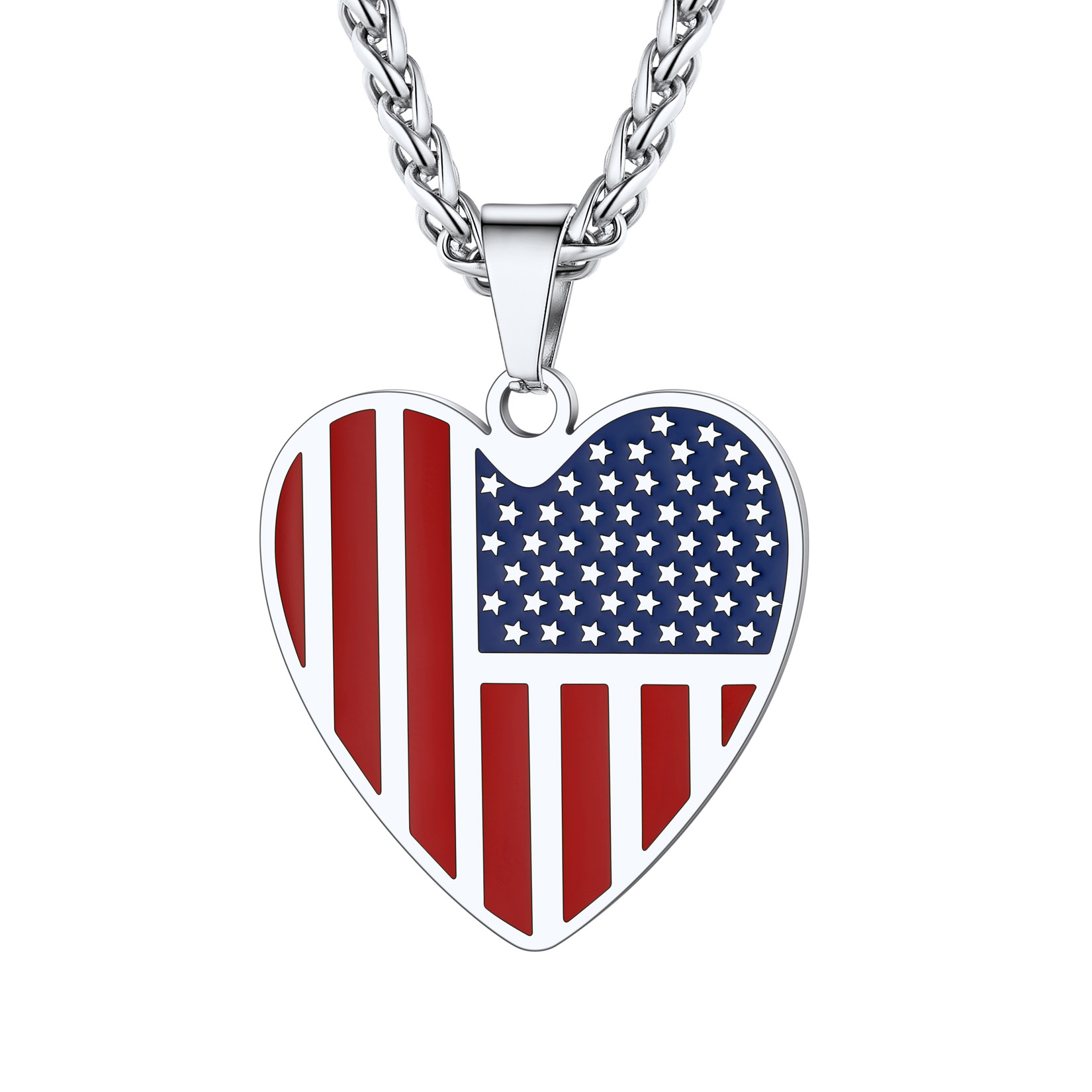 U7 American Flag Necklace Red Heart Enamel Pendant Stainless Steel Patriotic National/Independence Day July 4th Gift Necklace For Men Women