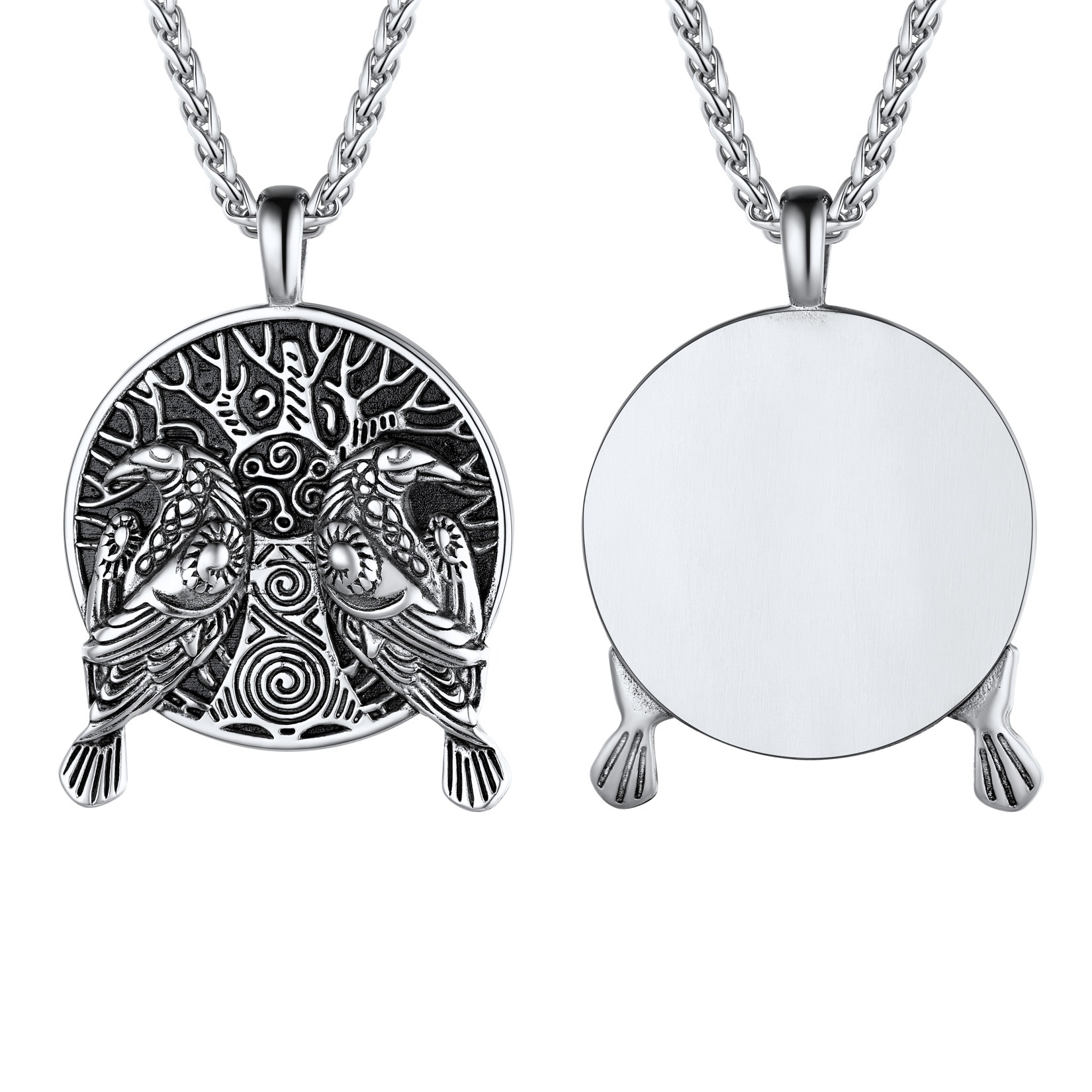 U7 Norse Rune Raven Vintage Stainless Steel Viking Pendant Big Crows Tree of Life Medal Silver Necklaces for Men Women