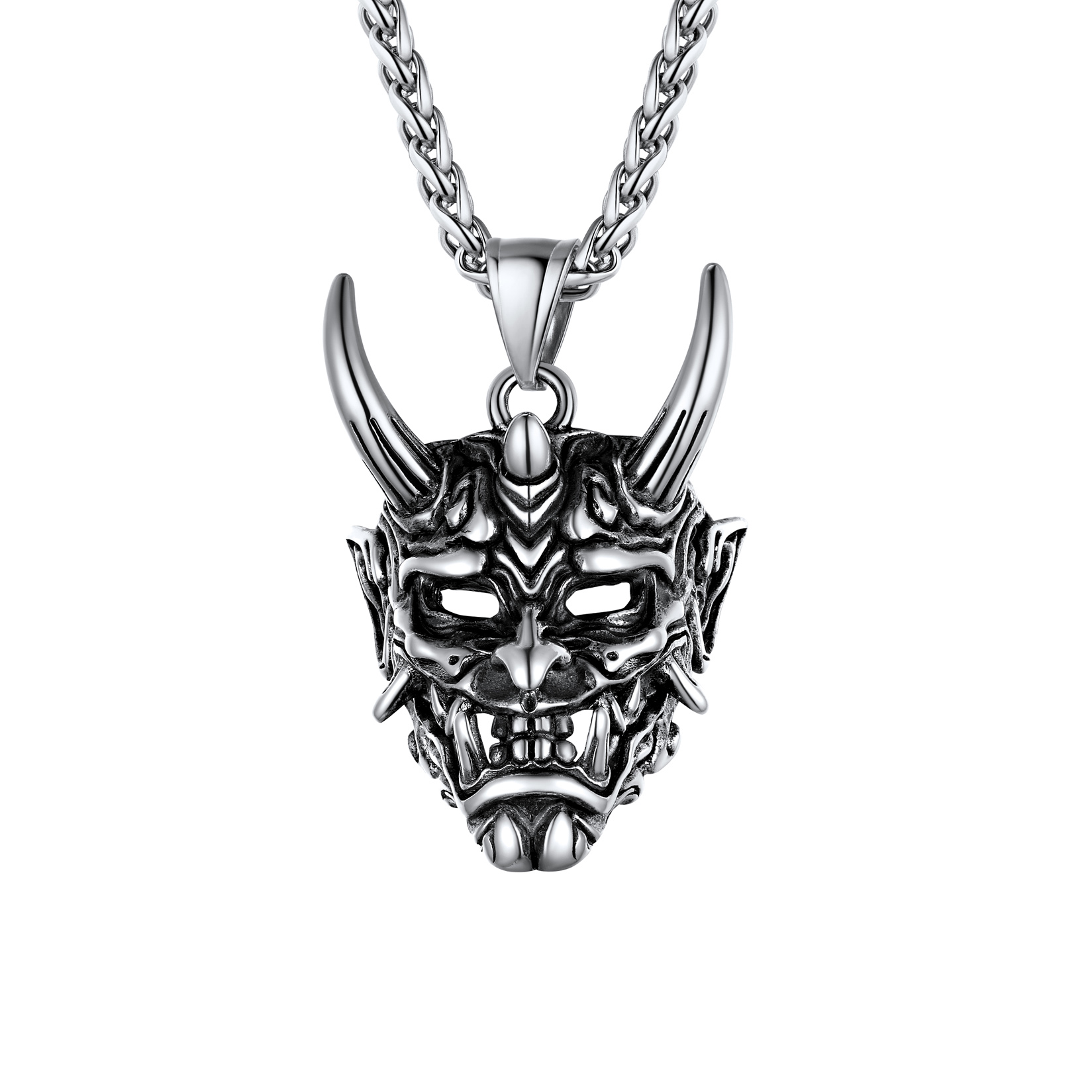 U7 Demon Horn Hannaya Mask Pendant Silver/Black Metal Punk Necklace for Men