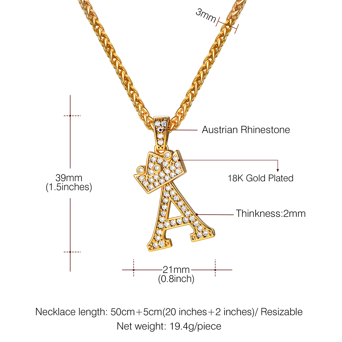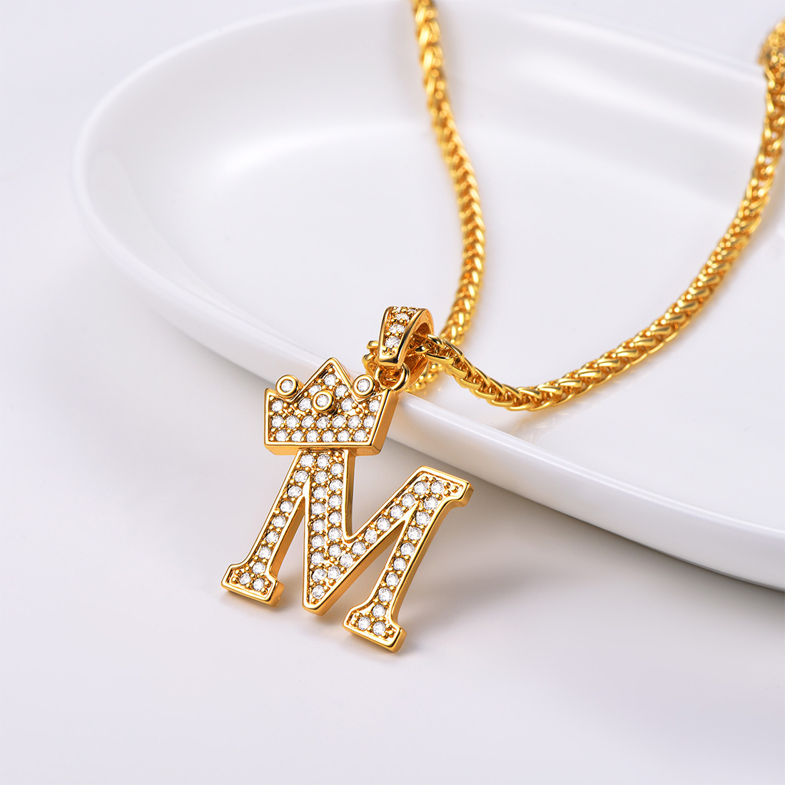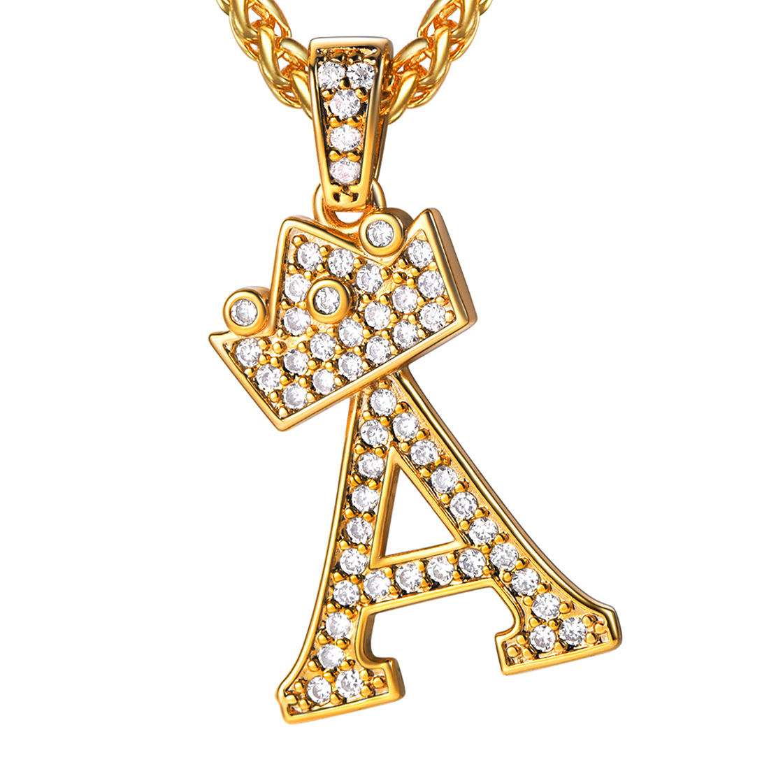 U7 Initial Crown Alphabet Necklace Cubic Zirconia Letter A-Z 18K Gold Plated Hip Hop Rapper Pendant Chain for Men Women