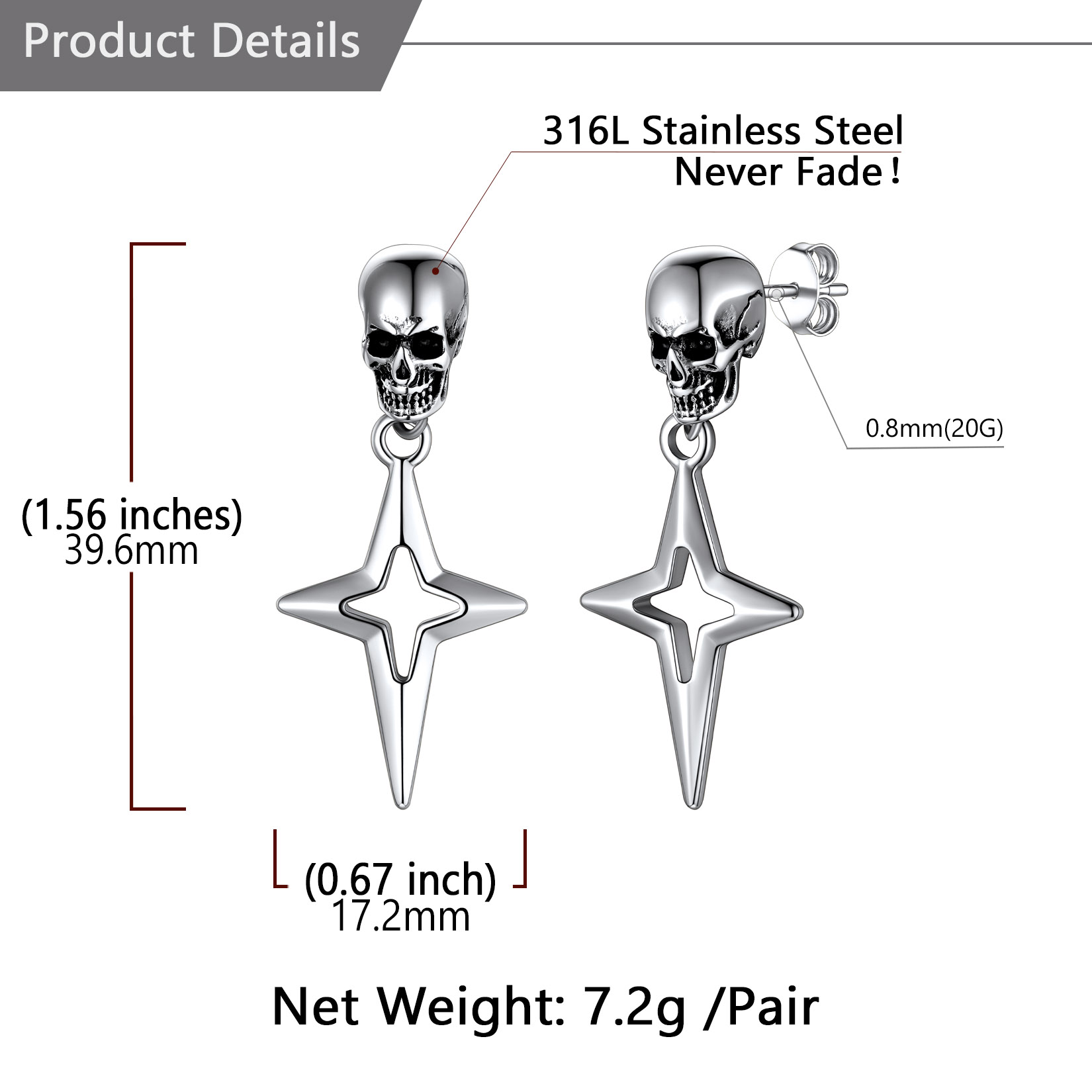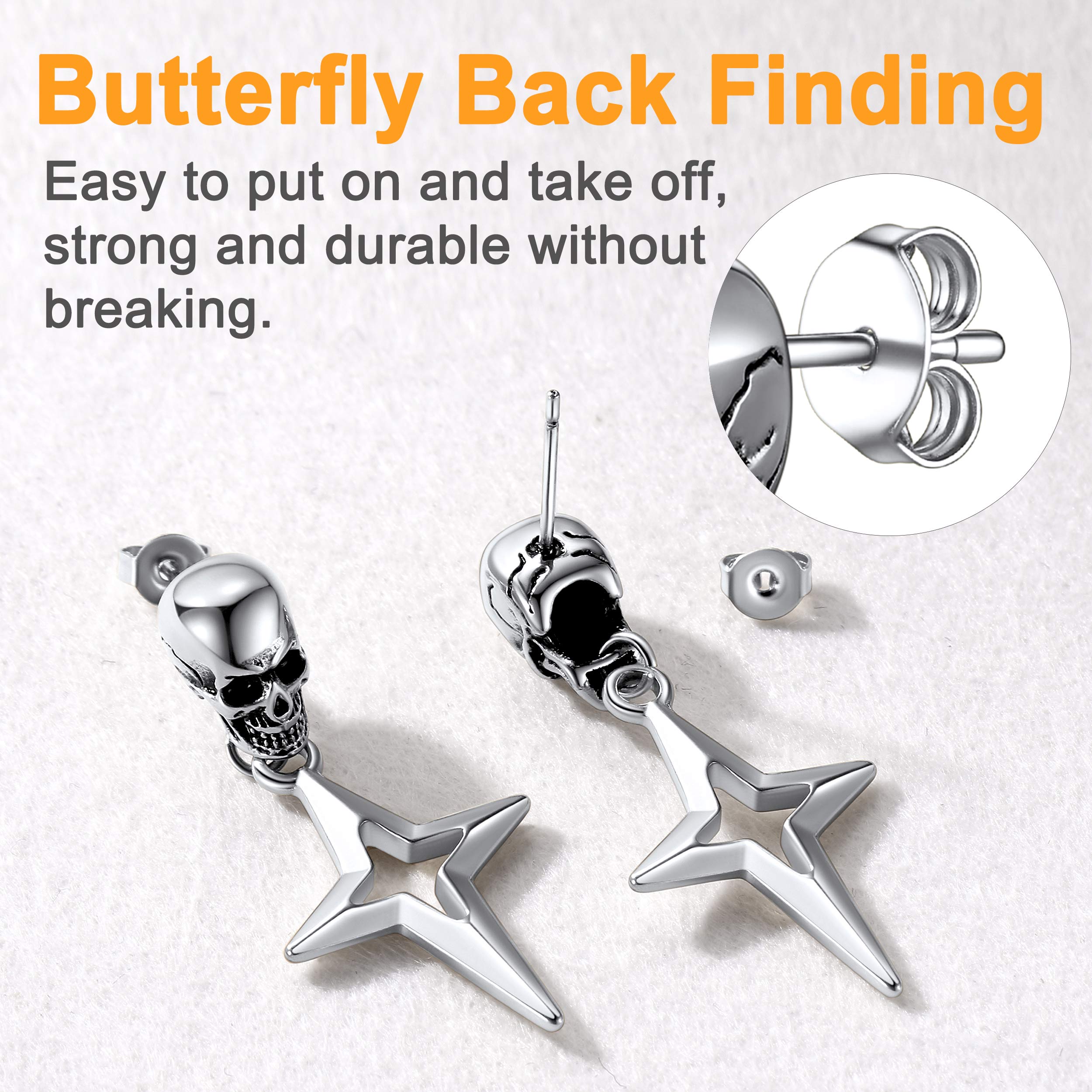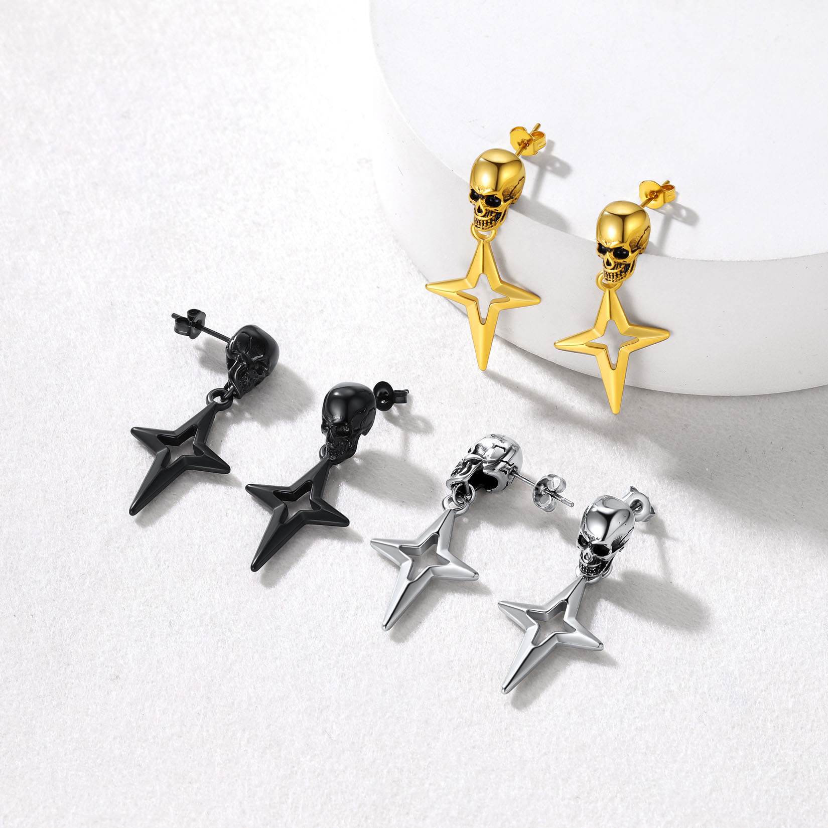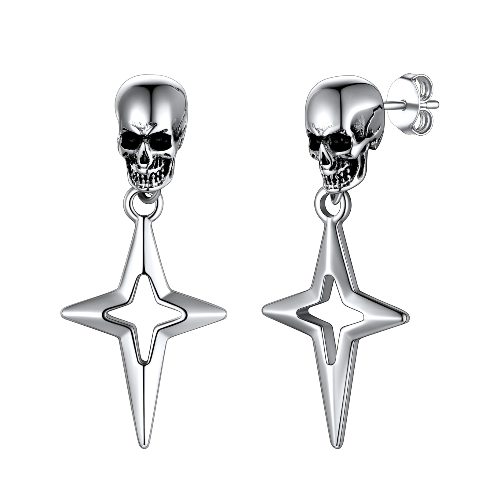Punk Star Dangle Earrings: Classic skull stud with hanging Star 4-Pointed design - shaped like a cross, a Christian graphic symbol. Amulet earrings with a punk feel. Perfect for daily.