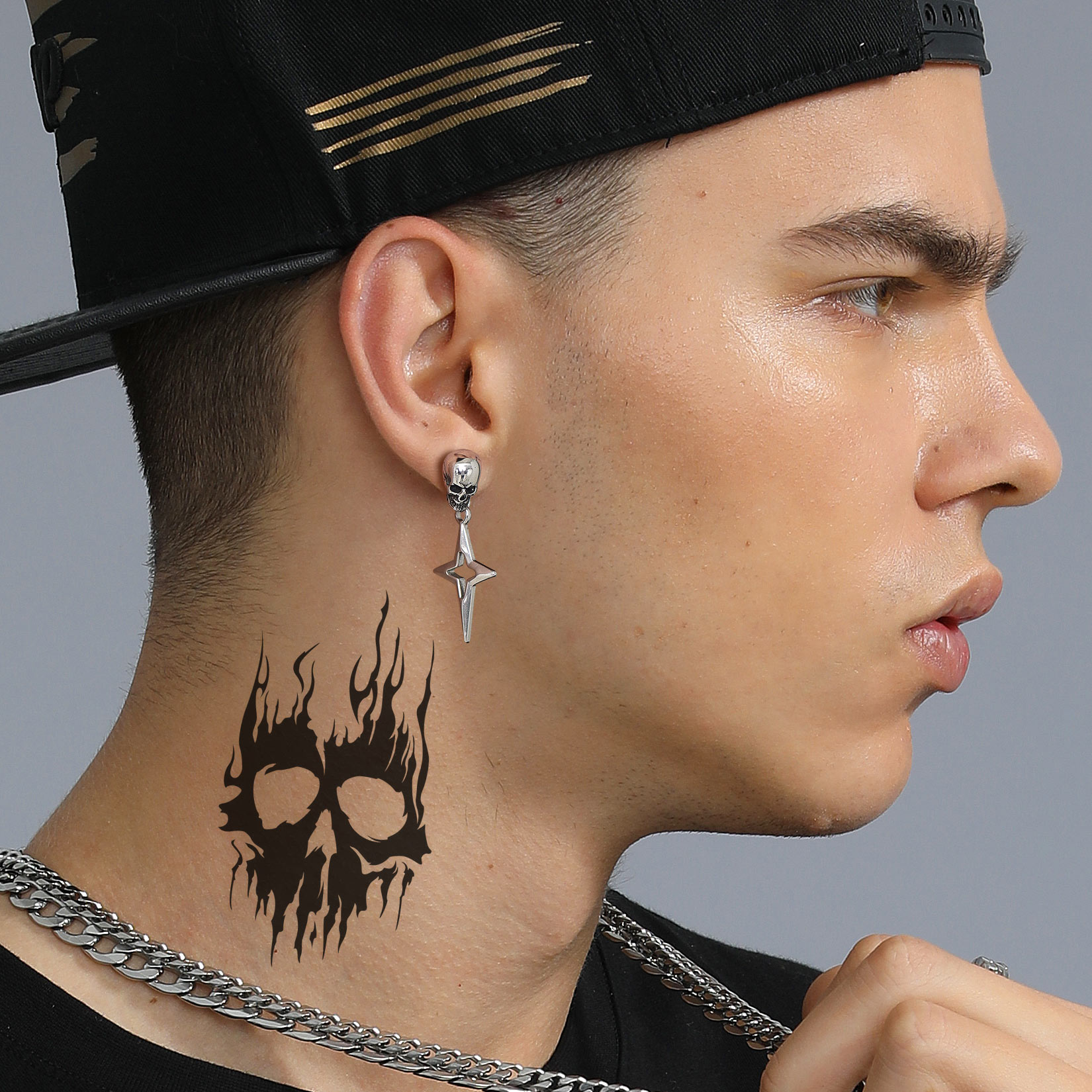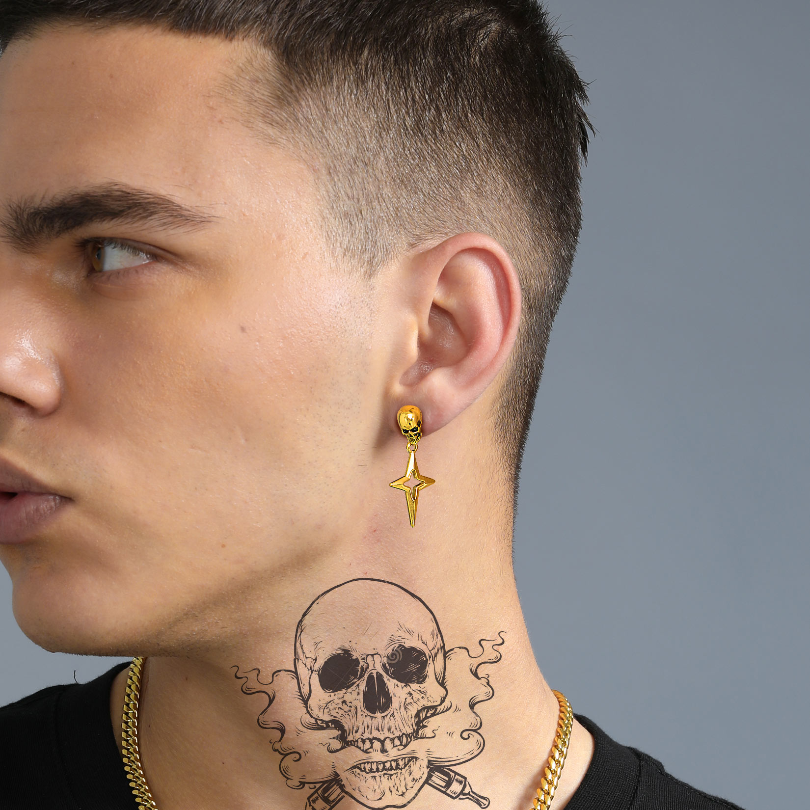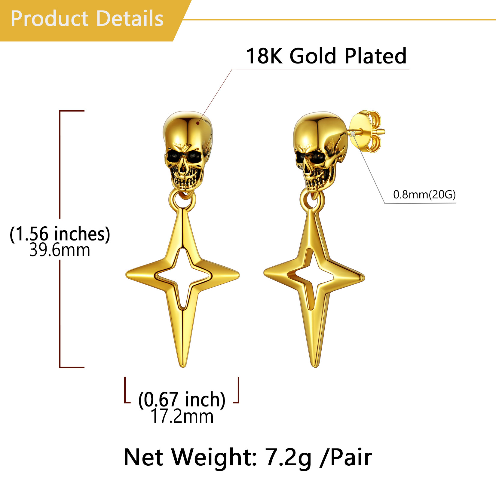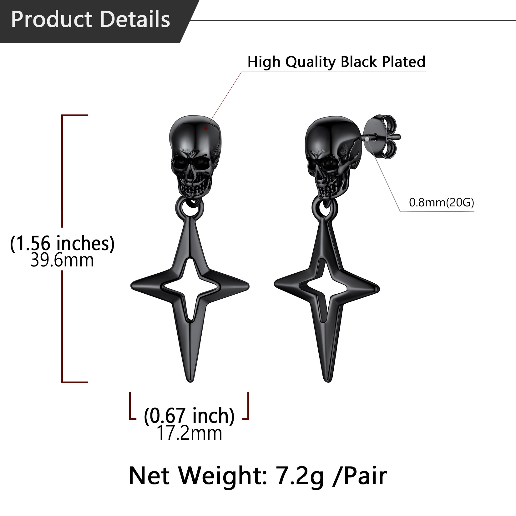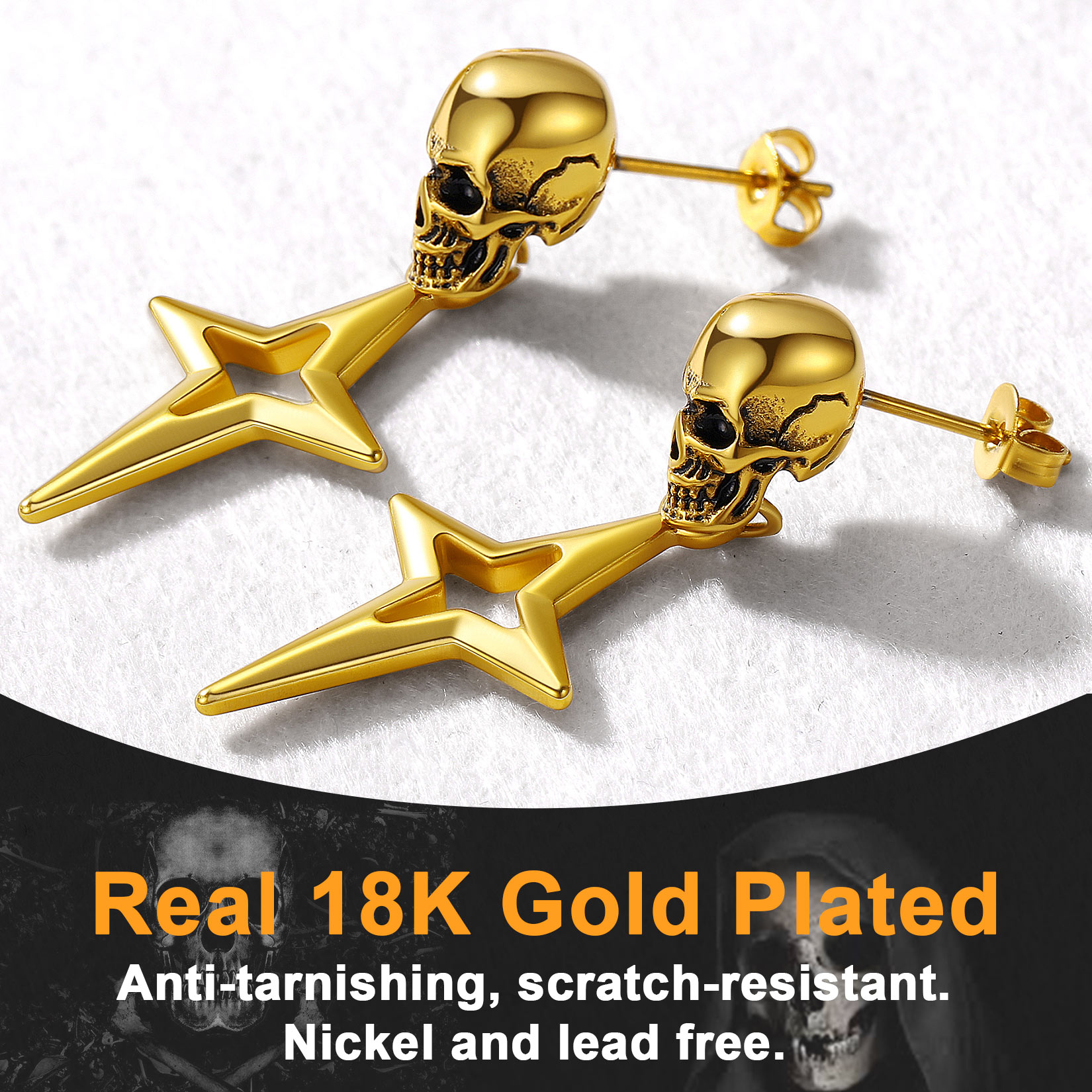 Punk Star Dangle Earrings: Classic skull stud with hanging Star 4-Pointed design - shaped like a cross, a Christian graphic symbol. Amulet earrings with a punk feel. Perfect for daily.