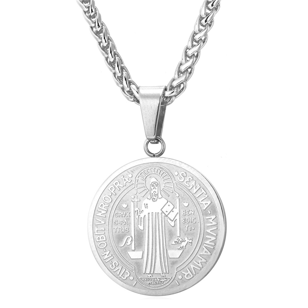 U7 Round Saint Benedict Medal Necklace Christian Jewelry Silver Chain for Men Women
