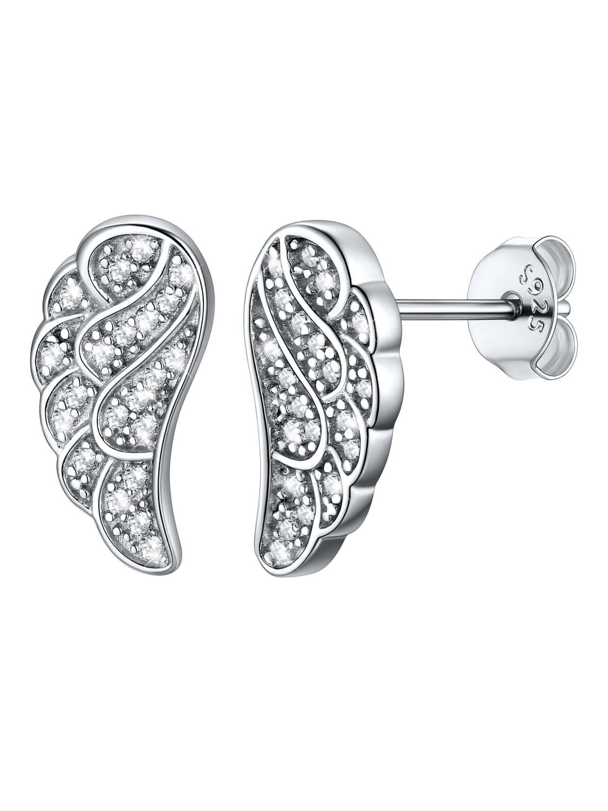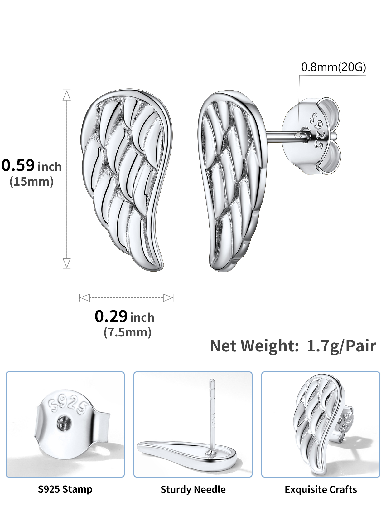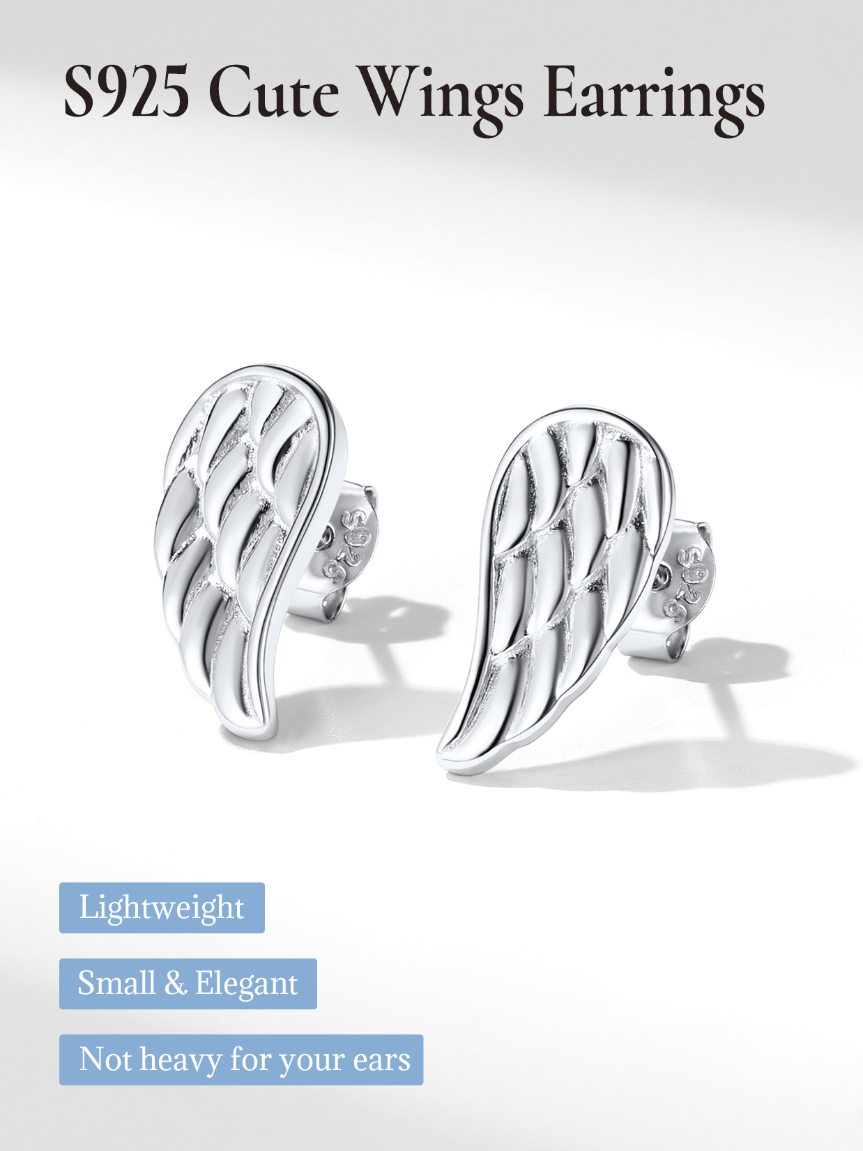 Sterling Silver Studs Earrings:>The dainty wings Earrings are made of 925 sterling silver, top quality exquisite platinum plating craftsmanship, high polished surface, smooth and glossy, color never fade, hypoallergenic, lead & nickel free. Exquisite carving techniques bring every feather to life.
