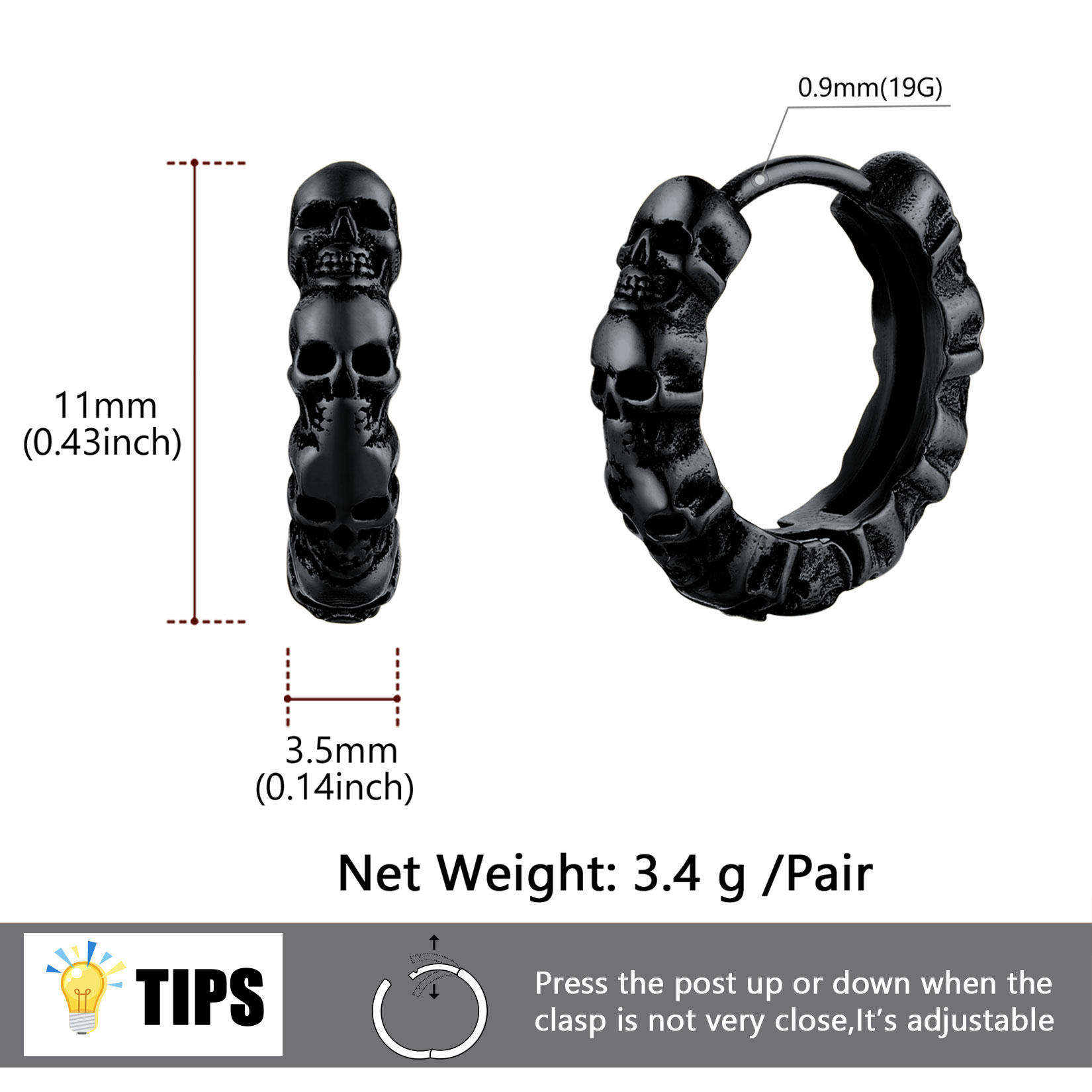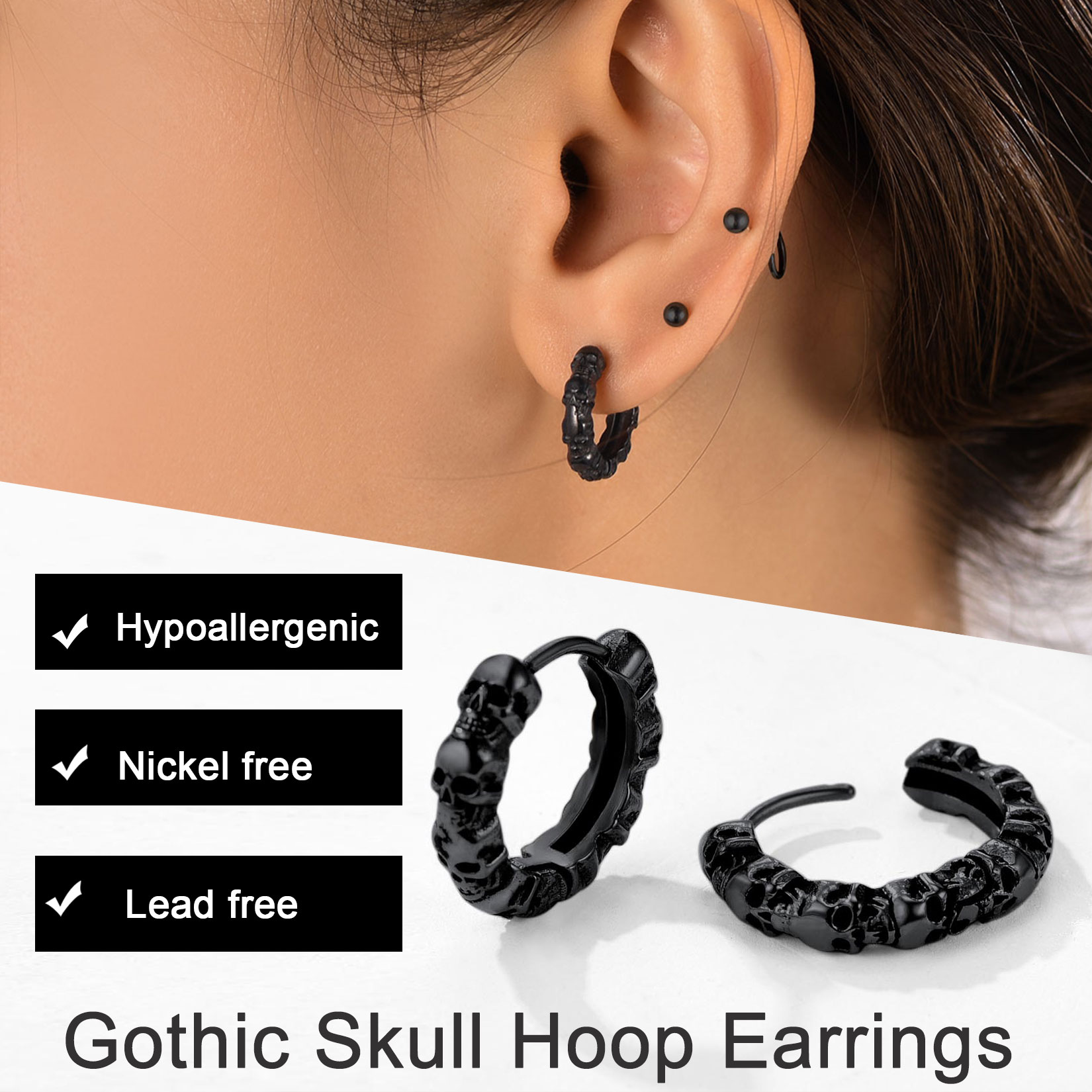 Product Design: Gothic skull skeleton earrings: vintage enamel black skell head design hoop earrings, very cool and striking, perfect gift for rapper, hallween accesories for men and boy.